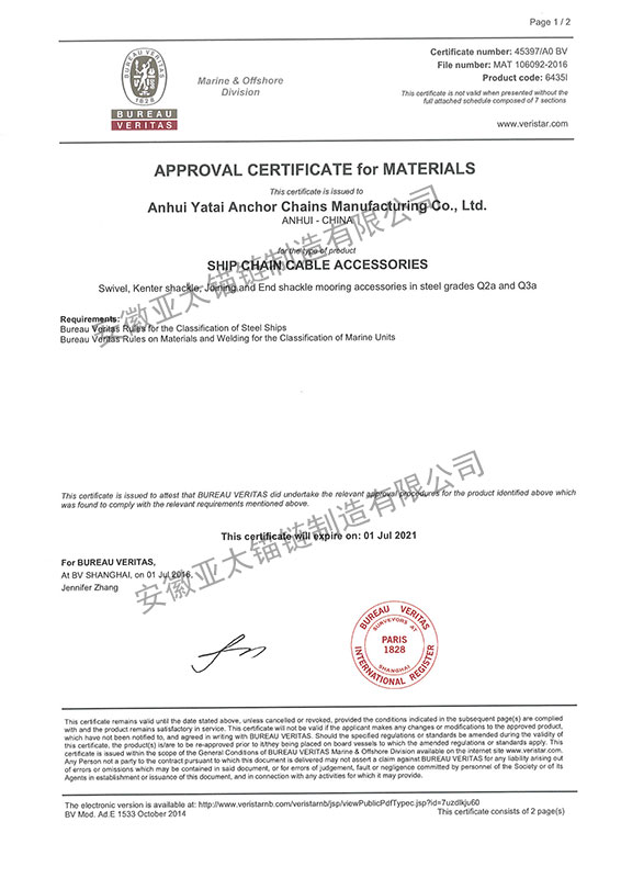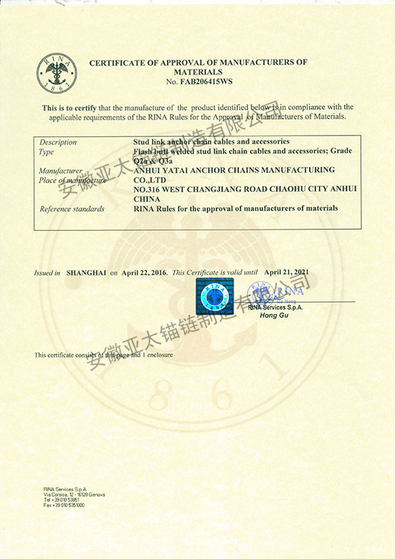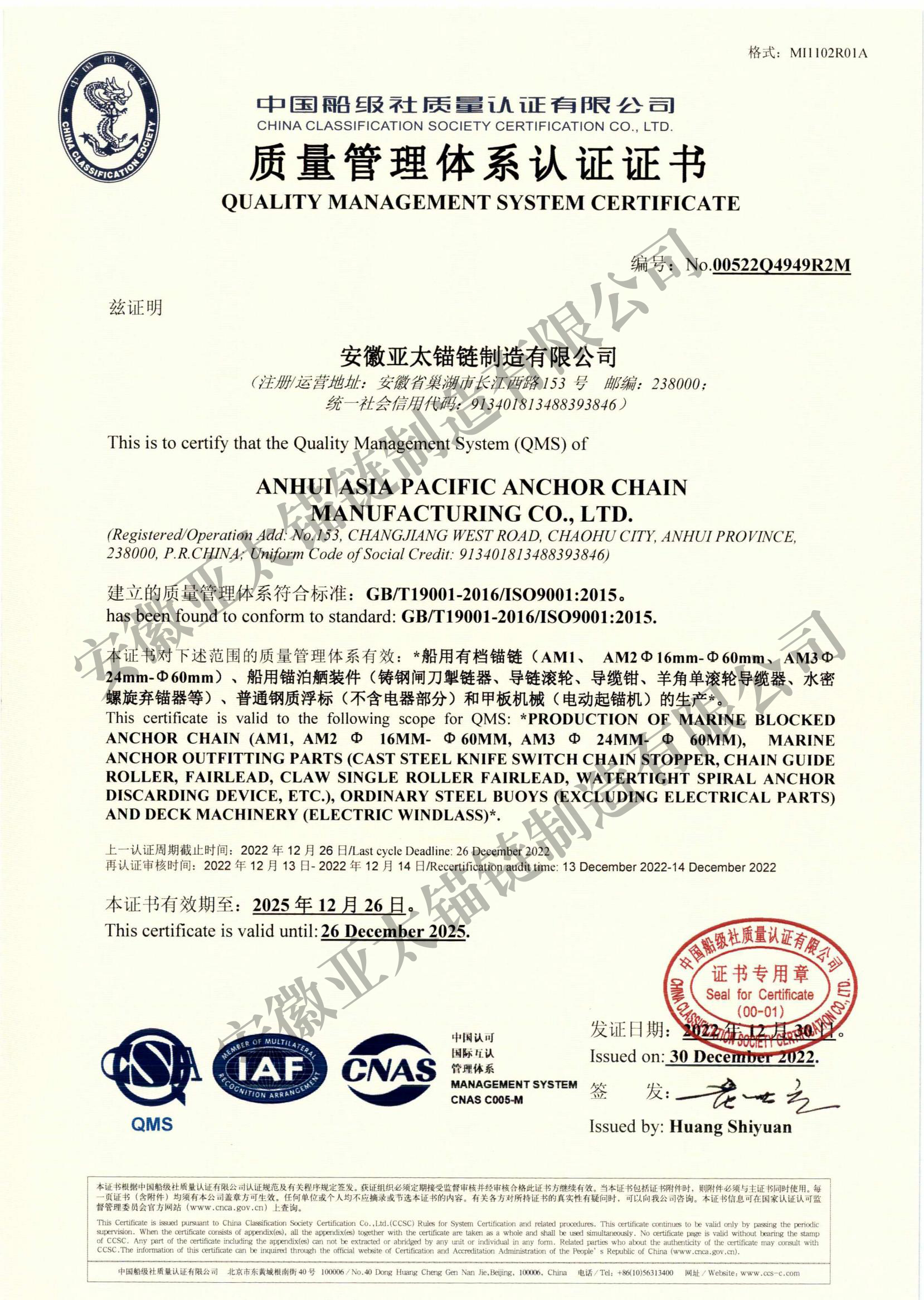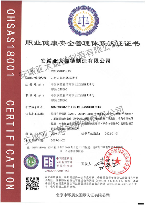 安徽亞太錨鏈制造有限公司是國家高新技術(shù)企業(yè),也是國家GB/T 549-2017《電焊錨鏈》標(biāo)準(zhǔn)的起草和制定單位之一。公司旗下設(shè)有錨鏈分廠、浮標(biāo)分廠、舾裝件分廠等多個(gè)分廠。公司專業(yè)從事φ12.5mm-φ107mm二、三級船用錨鏈、浮標(biāo)錨鏈、錨鏈附件,錨、船舶曬裝產(chǎn)品、航標(biāo)、系船浮、船型標(biāo)、多種規(guī)格海洋監(jiān)測浮標(biāo)及航標(biāo)燈等產(chǎn)品的生產(chǎn)、安裝和服務(wù)。目前公司的產(chǎn)品銷往全國各地船廠、碼頭、航標(biāo)處、航道局、海洋局,并已走上國際市場,如東南亞、中東、歐美等國家。